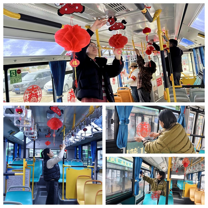 太湖公交分公司從網(wǎng)上精選現(xiàn)代窗花,搭配寓意深遠(yuǎn)的生肖燈籠,把年俗文化與時代印記巧妙融入八米車廂,讓濃濃的年節(jié)氣息伴隨每一位乘客的旅途。許多乘客一上車,看到福字和馬年燈籠,就紛紛感慨:“特別有過年的感覺,心里暖洋洋的!”